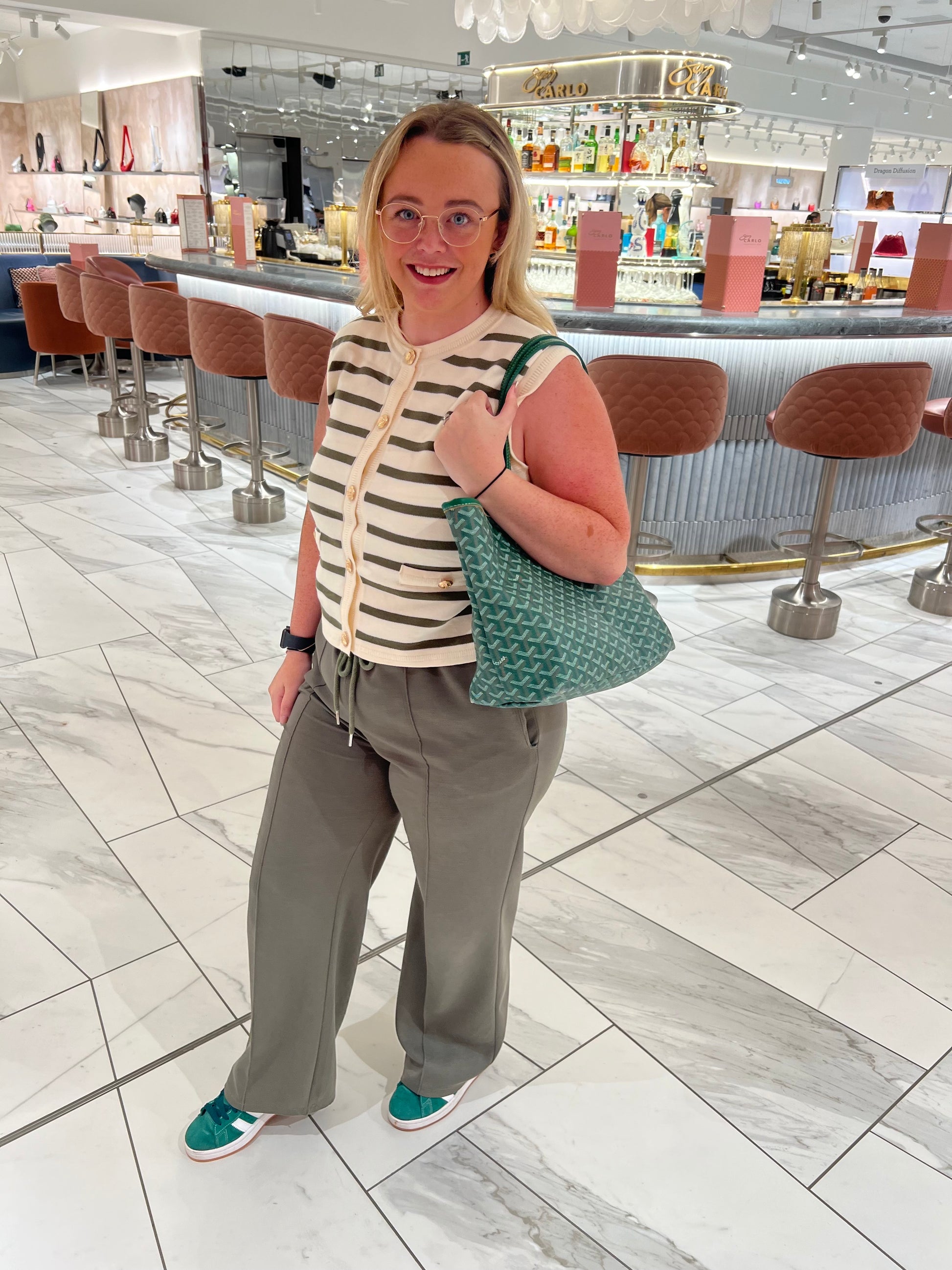 Knitted vest with gorgeous gold buttons. Suitable for any occasion. Paired here with our beige wide leg joggers for a casual look. One size fits from a size 4- 16 our model is a size 12/14 wearing one size.