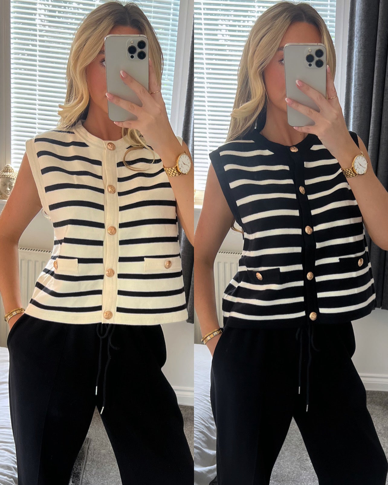 Knitted vest with gorgeous gold buttons. Suitable for any occasion. Paired here with our beige wide leg joggers for a casual look. One size fits from a size 4- 16 our model is a size 6 wearing one size.